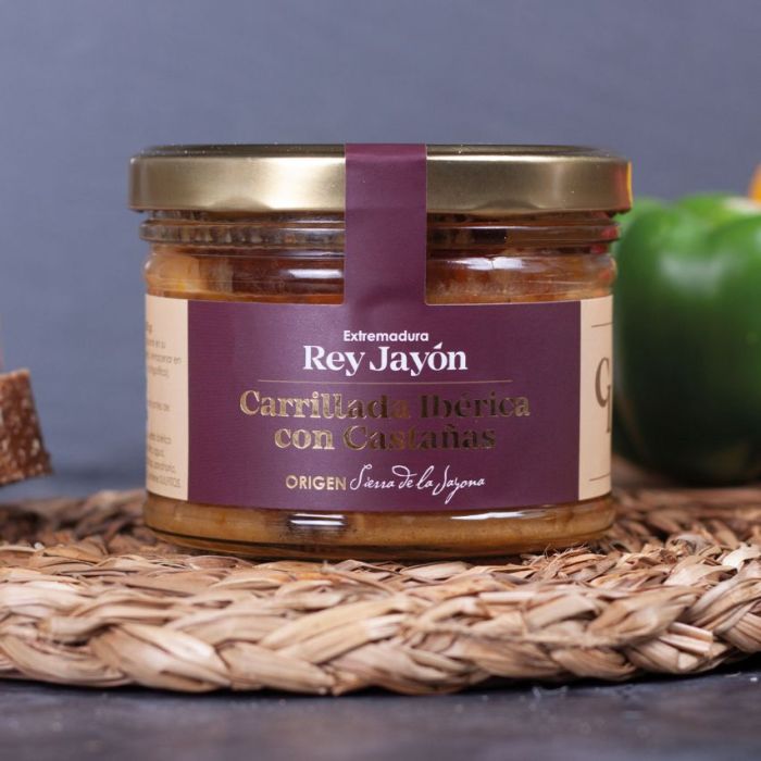 Carrillada de Cerdo Ibérico, aceite de oliva, agua, cebolla, vino blanco, castañas, zanahoria, ajo, sal y pimienta negra